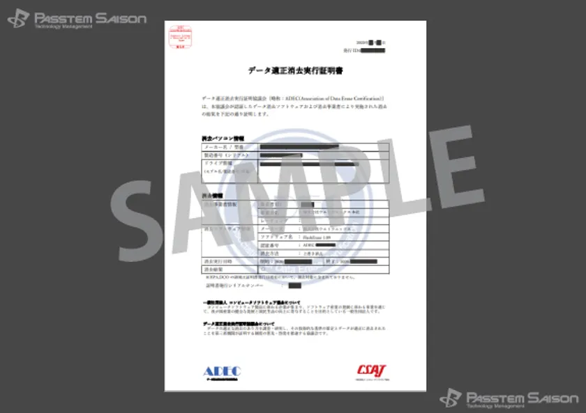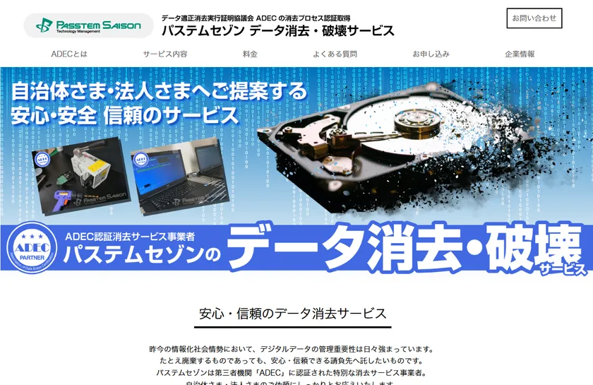 パステムセゾンはデータの取り扱いにおきまして、データ適正消去実行証明協議会(ADEC: https://adec-cert.jp/ )からの消去プロセス認証を受けた上で、安心確実なデータ消去・破壊サービスをご提供いたします。