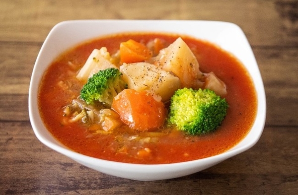 イタリアで定番となった、トマト味のミネストローネ。トマト味が濃厚。 ペンネをトッピングしてもおいしくいただけます。