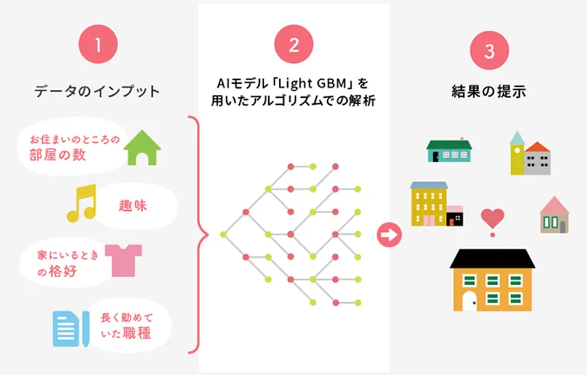AIは実際に施設に入居したかた1,000件以上のデータから構築。今までの施設紹介サイトにはなかったような、対象者の「長く勤めていた職種」や「家にいるときの格好」など11の質問に回答することで、AIモデルが入居後幸せにつながるような相性の良い施設を導き出します。