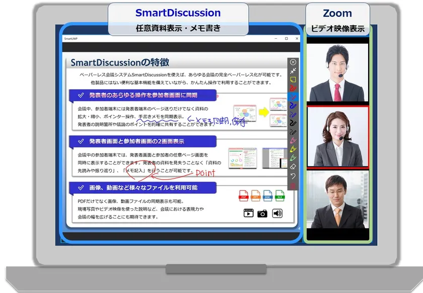 SmartDiscussionは、WindowsパソコンやiPadに会議資料を電子配信して参照・共有するシステムであり、会議で使用する大量の資料を効率的に取り扱うことができます。この特徴を生かしてシステムを連携させ、Zoomで映像と音声を伝達しつつ、会議資料はSmartDiscussionで配信・共有することにより、オンライン会議においても会議資料の視認性やメモ書きなどの操作性を損なうことなく会議を開催することができます。