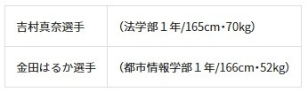 女子は2名が出場予定です。名古屋大谷高校出身の吉村真奈選手(法学部1年)は、東海学生柔道女子体重別選手権大会70㎏級で優勝し、全国大会や講道館杯にも出場経験があります。体幹が強く、組み力も抜群で、粘り強い柔道が彼女の強みです。