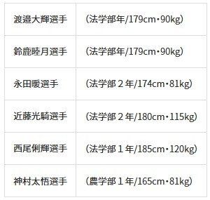 男子は6名が出場します。注目は、東福岡高校出身の西尾俐輝選手(法学部1年)です。全日本レベルの体格を持ち、特に寝技が非常に強く、寝技に持ち込めば相手を圧倒する力を発揮します。