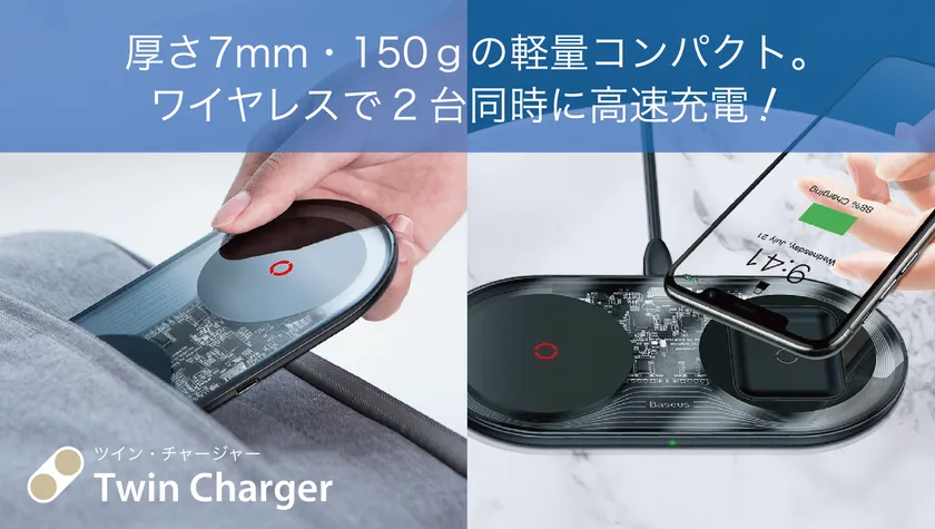 日本初上陸 厚さ7mm・重さ130gで2台同時ワイヤレス充電! 『ツイン・チャージャー』を「Makuake」にて特別価格で提供開始