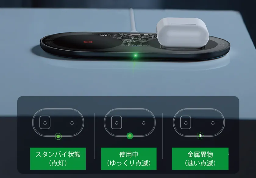 不要な電力消費を回避するために、充電に対応しないデバイスや金属異物の識別を行います。異物が識別されるとインジケータライトが頻繁に点滅してお知らせします。