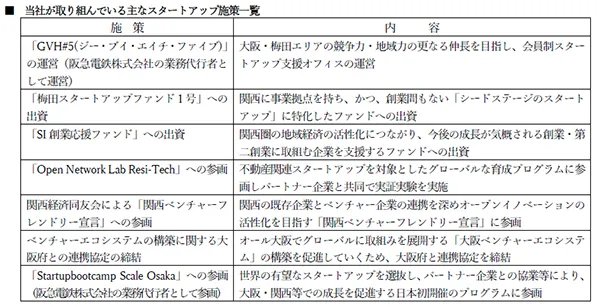 当社及び当社のグループ会社では、今後の急激な技術革新や社会的価値観の変化を見据えた既存事業の競争力強化や新規事業開発に向けて、「Open Network Lab Resi-tech」や「Startupbootcamp Scale Osaka」をはじめとしたアクセラレーションプログラムへの参画や本ファンドによる出資検討等を通じて、スタートアップとの共創を推進しております。今後も本ファンドからの出資等を通じたスタートアップとの共創を推進し、スタートアップが有する先端技術や革新的な事業手法と、当社が有する経営資源を、協業を通じて融合させることにより、お客さまへの新たな価値の提供に取り組んでまいります。