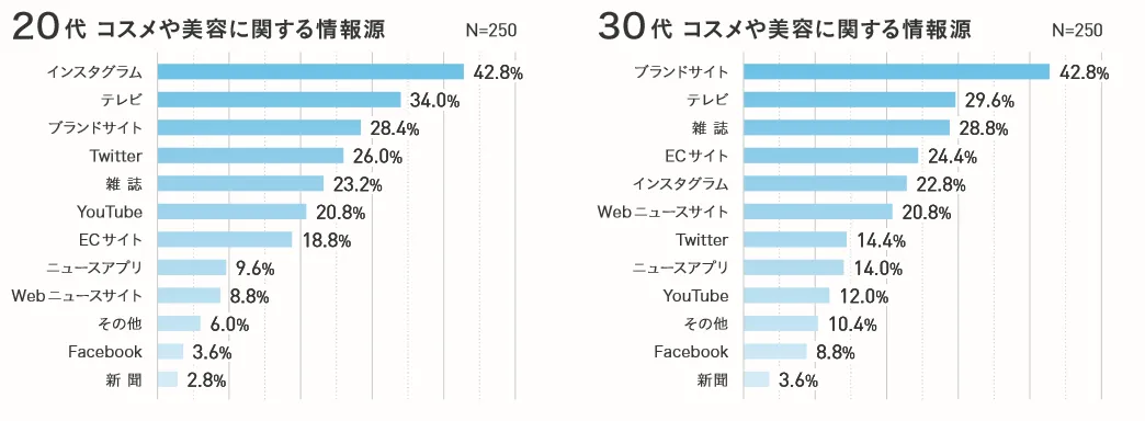 近年、とくに大切なのは、「視覚」情報。今回の調査でも、30代女性が情報源として挙げたのは、「ブランドサイト」や「テレビ」「雑誌」などに続いて「インスタグラム」(22.8%/5位)。さらに 20代女性では、情報源の1位が「インスタグラム(42.8%)」で、2位の「テレビ」(34%)と10ポイント近く差がありました。
