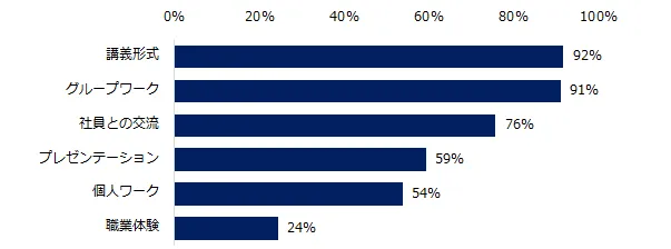 オンラインインターンシップに参加経験がある方に、「何日間のインターンに参加しましたか?」と伺ったところ、「1日間」(88%)が最多でした。体験したコンテンツ内容を伺うと、「講義形式」(92%)と「グループワーク」(91%)が多く、次いで「社員との交流」(76%)、「プレゼンテーション」(59%)が続きます。