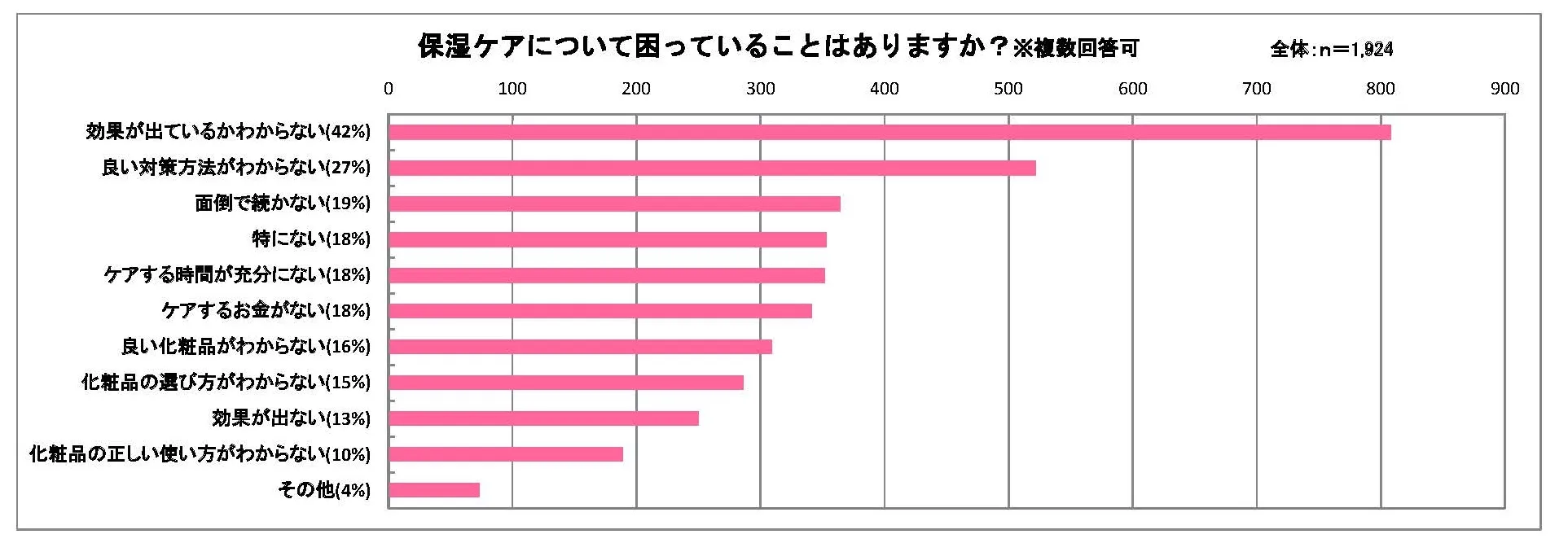 保湿ケアで困っていることを聞いたところ、1位「効果が出ているかわからない」、