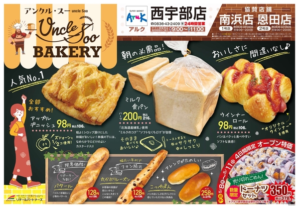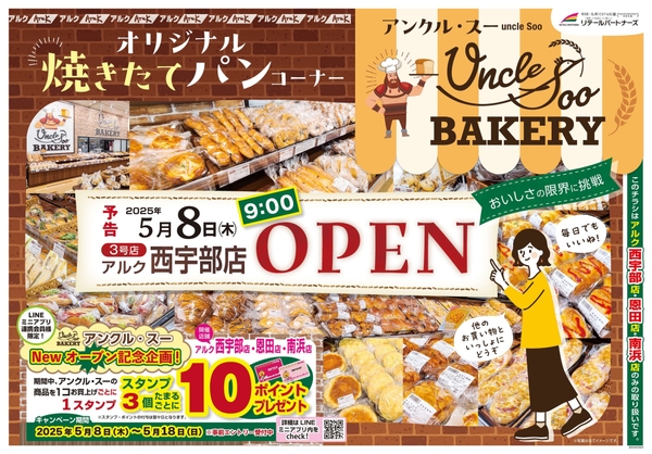 2025年5月8日(木)、株式会社リテールパートナーズの事業会社である株式会社丸久のアルク西宇部店(山口県宇部市厚南北五丁目1番25号)にオリジナル焼きたてパンコーナー「アンクル・スー」 がオープンいたします。