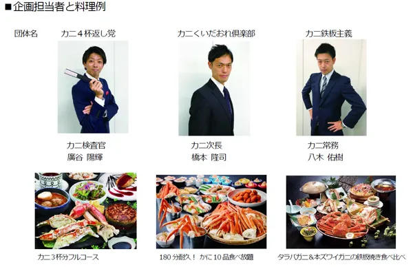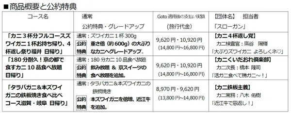 今回のラインナップは、「ズワイカニ3杯を食し1杯をお持ち帰りする福井の旅」、「180分間カニ料理10品が食べ放題の京都の旅」、そして、「タラバガニ&本ズワイガニの鉄板焼きを食す滋賀・岐阜の旅」の3コースです。食はもとより、各地の旬の観光スポットも巡る内容に加えて、ツアーのグレードアップ内容と企画担当者のアピールにご注目いただき、ツアーに出発する前からワクワクしていただく取り組みにご期待ください。