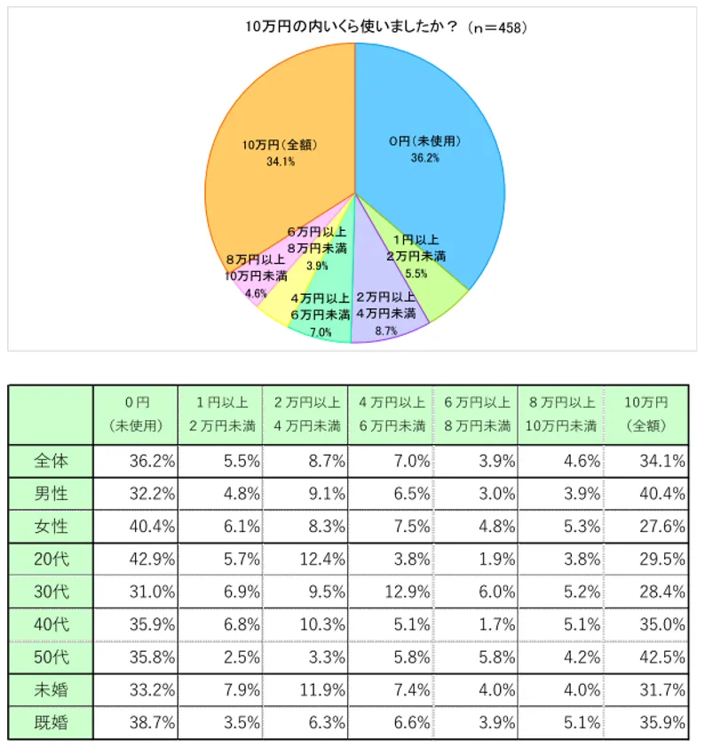 特別定額給付金の給付を受けた方に対して、受給金額10万円の消費状況を調査したところ、「0円(未使用)」(回答率36.2%)が最多となり、「10万円(全額)」(同34.1%)、「2万円以上4万円未満」(同8.7%)、「4万円以上6万円未満」(同7.0%)の順となりました。