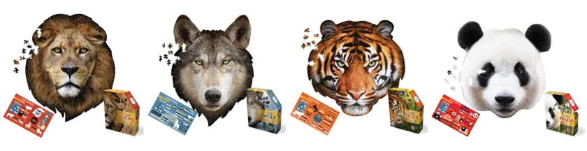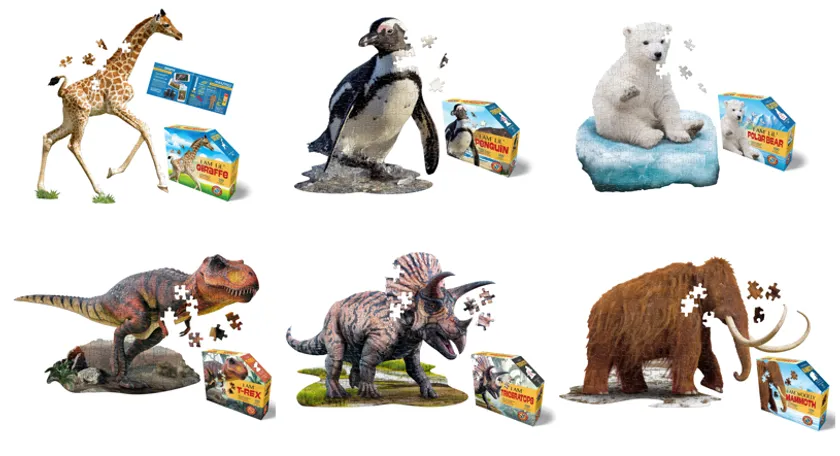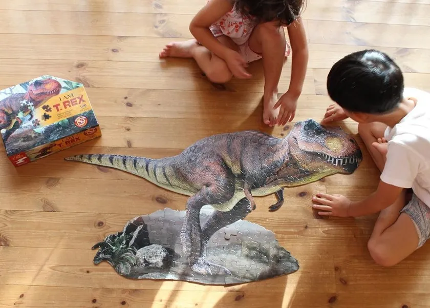 一般的なジグソーパズルは枠から固めて完成させるのに対し、動物や恐竜のカタチそのままにカットされた当パズルに定石はありません。色分けしたり、写真を見ながら想像したりと、遊び手の自由な発想で完成を目指します。難易度はピース数以上です。