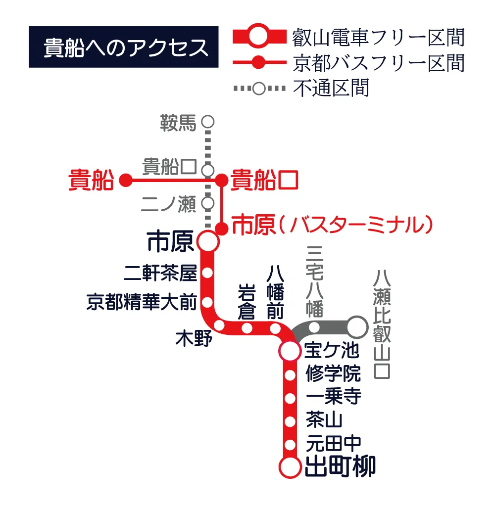 現在、土砂災害の影響により、叡山電車鞍馬線は市原駅~鞍馬駅間で運転を休止しております。(市原バス停~貴船口バス停は京都バスフリー区間です。)