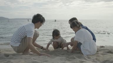 ムービーの後半では、海で遊ぶ紅愛ちゃんに同行。波打ち際ではしゃぐ紅愛ちゃんたちを映しながらも、制作陣の間には、少し緊張した空気が漂っていました。実は、今年は会わないと決めていたおじいさまとおばあさまも、紅愛ちゃんたちの姿を見守りにこっそり海岸まで来られていたのです。砂浜から少し離れたところから孫たちを見守るおじいさまおばあさまの、やさしくも少し切なそうな眼差し。8歳の紅愛ちゃんの1日を通して見えてくる、新快速が運んできた様々な価値は、制作スタッフの胸にも迫るものがありました。