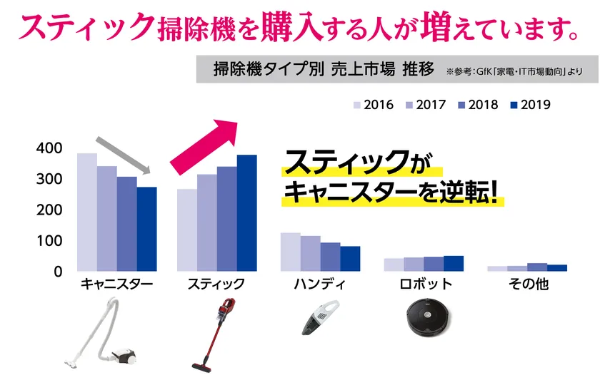 また近年では、利便性が高いスティックタイプ・コードレスタイプの掃除機がキャニスタータイプの掃除機よりも販売台数・売上規模が伸びているなどの家庭環境における変化も見られます。