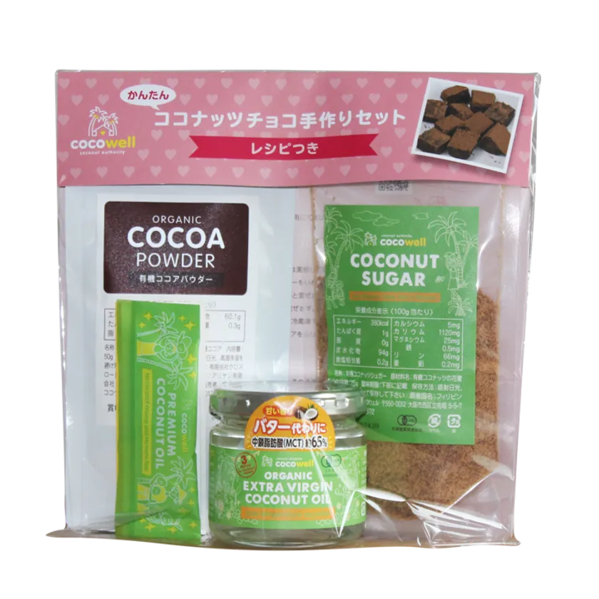 ココナッツ製品の製造・輸入・販売を行う日本で唯一のココナッツ専門店 株式会社ココウェル(所在地:大阪市西区 代表取締役:水井 裕)は、秋冬限定の「ココナッツチョコ手作りセット」を、取り扱い店舗で10月以降順次発売します。有機JAS認証取得のエキストラバージンココナッツオイル、ココナッツシュガー、ココアパウダーの3種を混ぜて冷やすだけの簡単工程。小さなお子さんとも安心して一緒に作れます。濃厚なくちどけ食感なのに、身体に優しく罪悪感なく食べられるギルティフリースイーツとして、普段はもちろん、クリスマスやバレンタインの手作りギフトにもおすすめです。