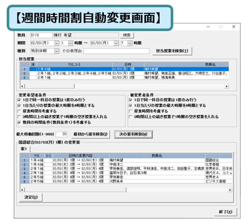 年間スケジュールで予定できない突発的・一時的な理由による授業変更を、週単位の時間割に反映する「一時変更機能」。