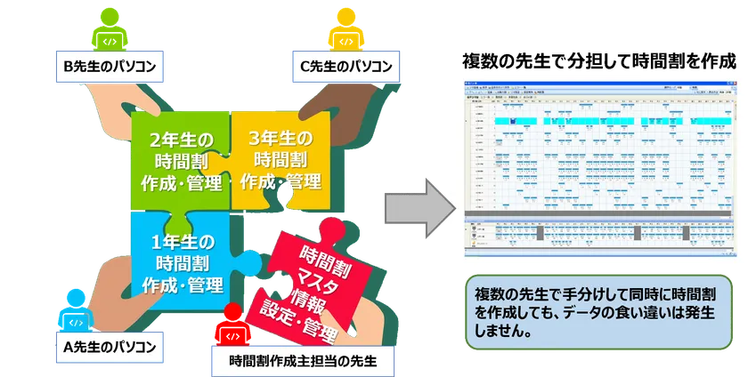 複数の先生が同時に時間割の入力・作成・管理・運用を行うことができる「マルチユーザー機能」