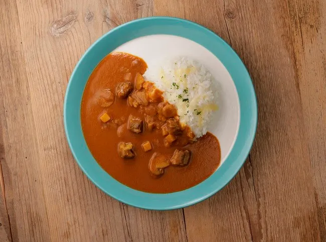 牛肉、じゃがいも、マッシュルームなどが入った、辛みを抑えたマイルドなカレー。