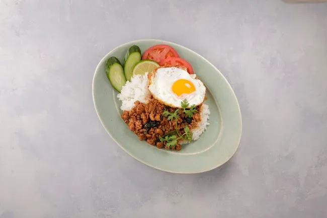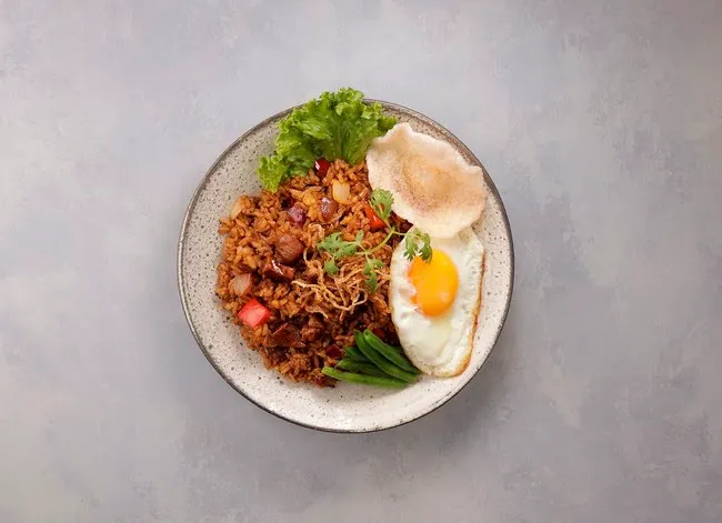 鶏肉、パプリカや玉ねぎ入りの海老ペースト風味が効いた旨辛ナシゴレンのベース。