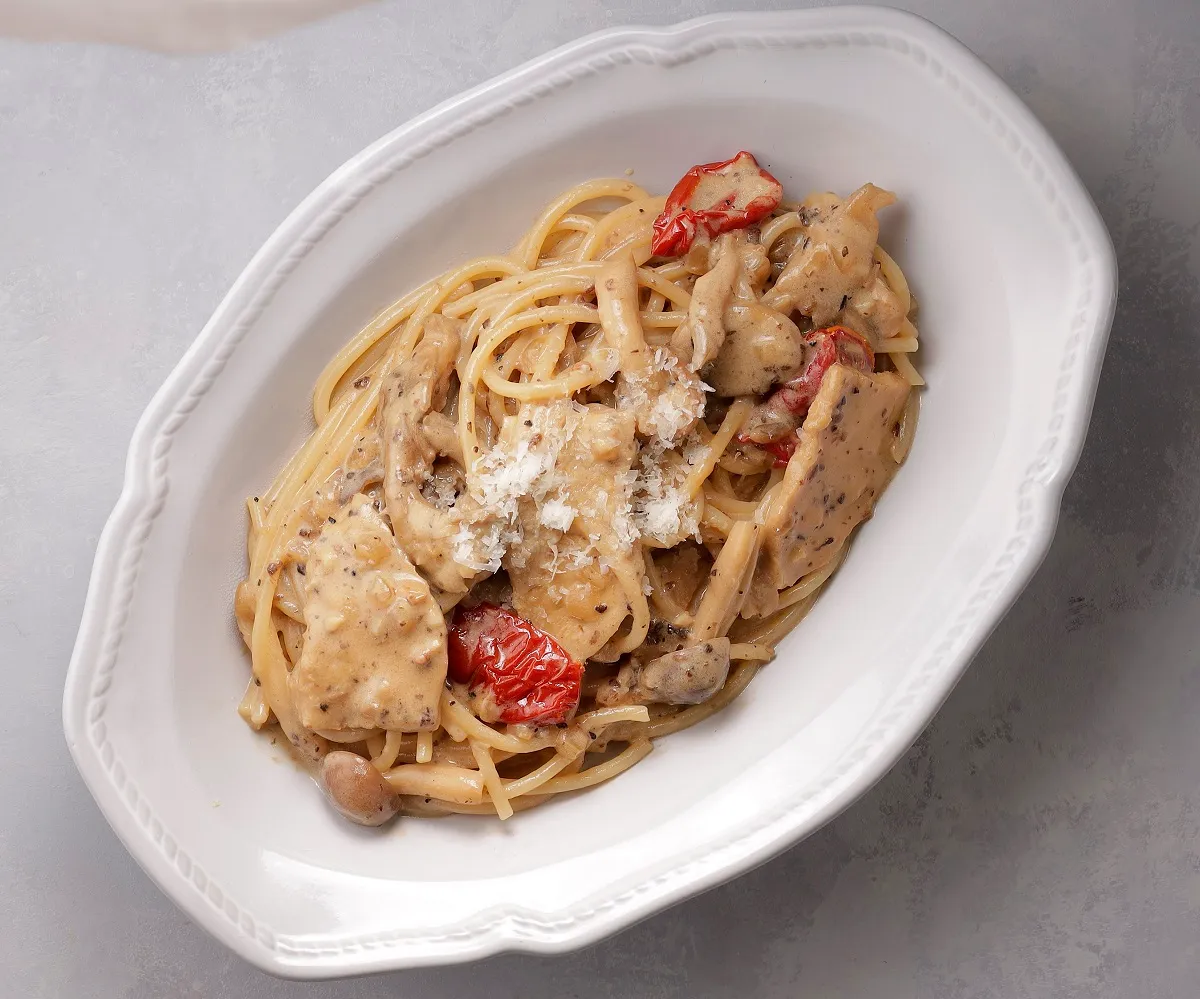 キノコの香り豊かな鶏むね肉入りのクリームソース。隠し味にグラスドビアンとドライトマトを。
