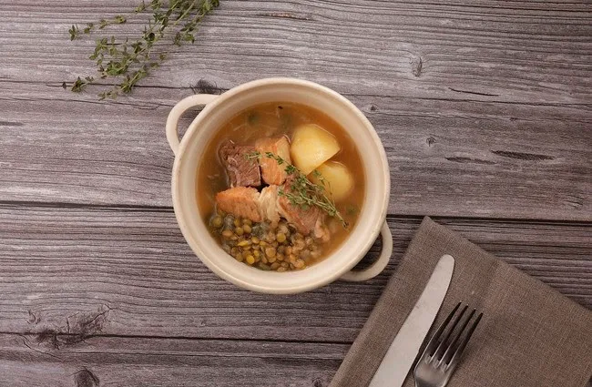 煮込んだ豚バラ肉の甘みに相性の良いレンズ豆を加えました。