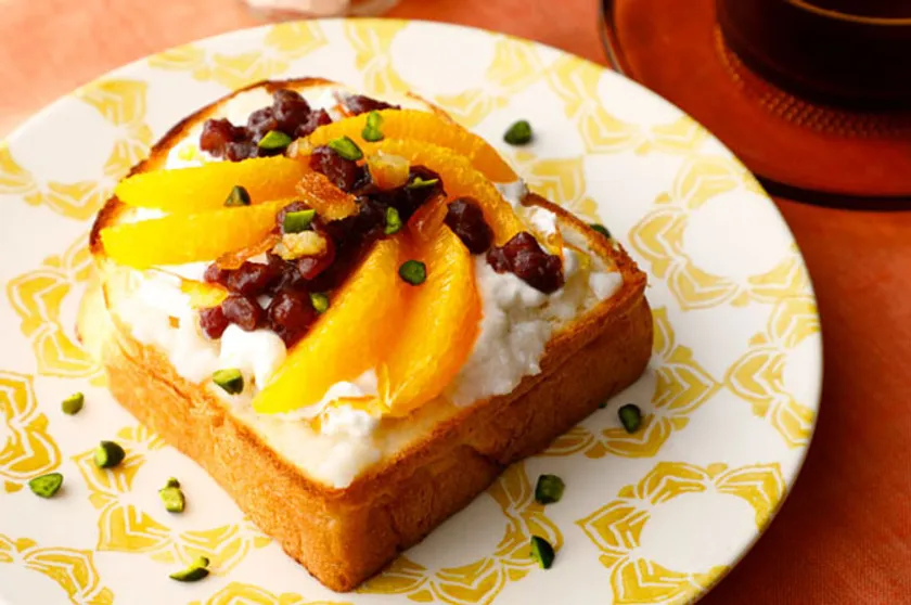 和の食材「甘酒、つぶあん」と洋の食材「オレンジ、生クリーム、ピスタチオ」のバランスが絶妙!甘酒とオレンジの自然な甘味を楽しめます。