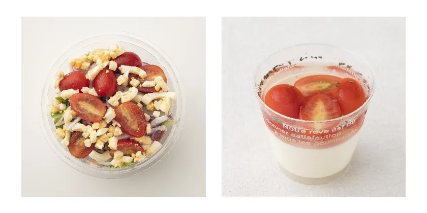 左:「あまーいフルーツトマトとゆで卵のサラダカッペリーニ」 右:「あまーいフルーツトマトとバジルのレモンフロマージュゼリー」