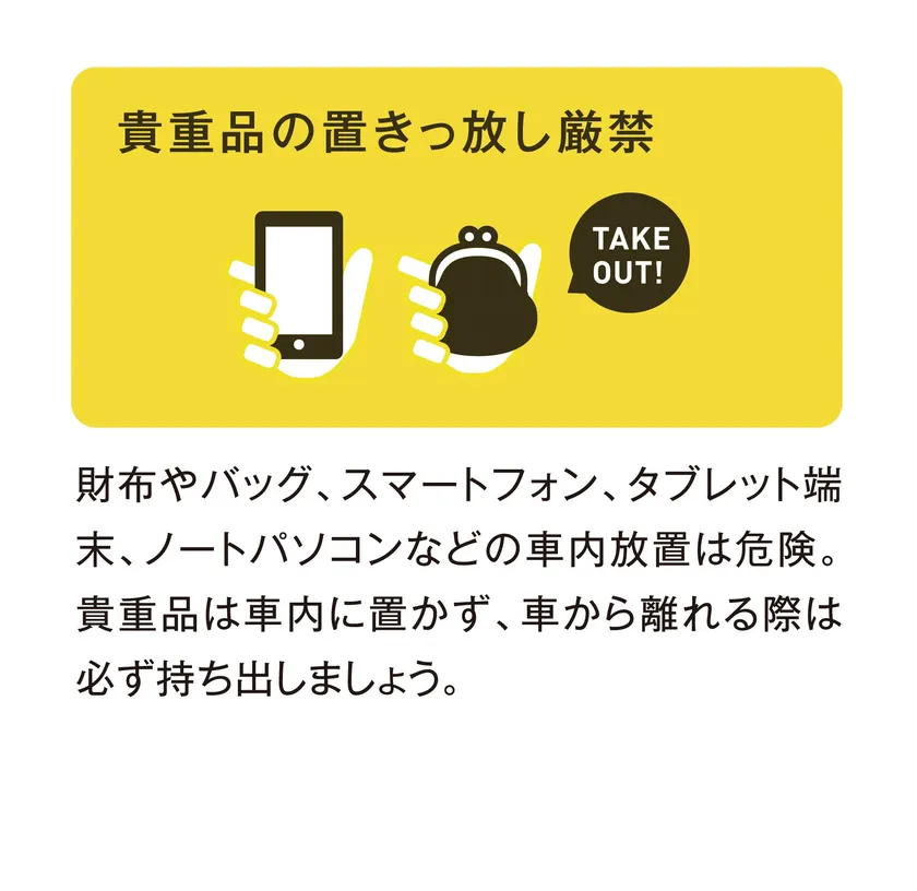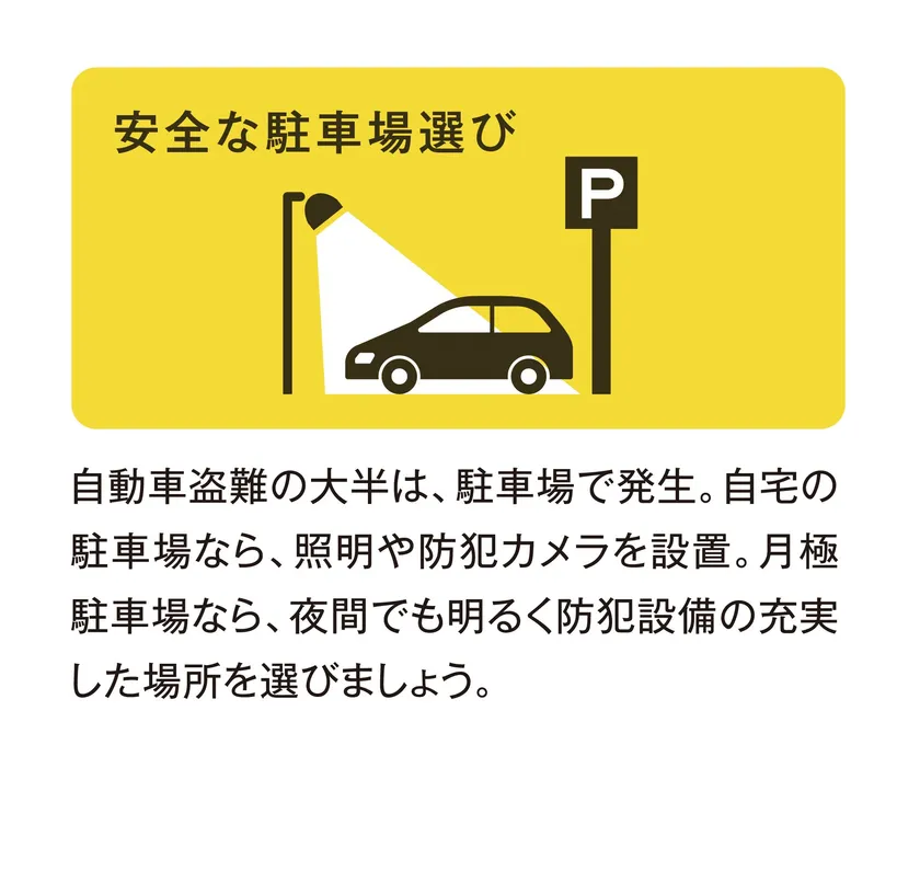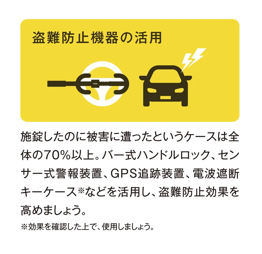 官民合同プロジェクトチームに参加する各団体および各都道府県自動車盗難等防止協議会のほか、協力団体の関連場所(警察署、自動車ディーラー、整備工場、自動車教習所、駐車場など)において、「自動車盗難防止啓発ポスター」を掲出するとともに、「自動車盗難防止啓発チラシ」を配布します。