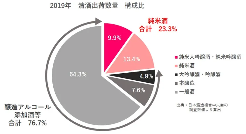 日本国内の清酒出荷量における純米酒比率は全体の4分の1以下と低く、4分の3以上が醸造アルコールを添加した一般酒等で構成されています。純米酒の構成比は増加傾向にあるものの、製造量の全量を純米酒のみが占める酒蔵はまだまだ少数派と言えます。