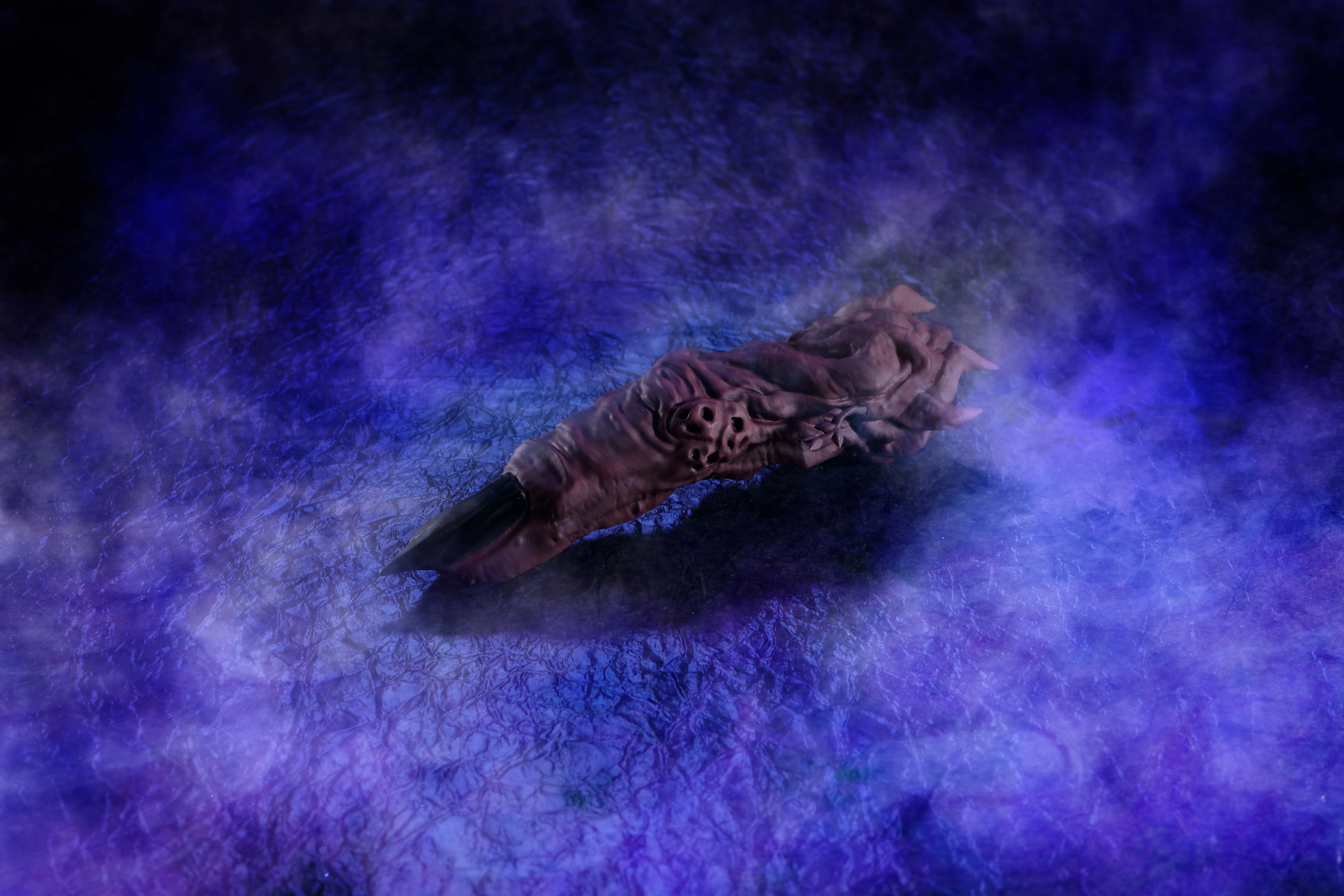 本商品は、観賞用や約1/1スケールのなりきりグッズとしても利用可能なディスプレイモデルです。リアルな造形と彩色にこだわり、アニメの3面図設定より忠実に再現。造形は、木の根のようなうねりの部分など、さまざまな角度から見た時も設定に近い造形となるよう再現しています。彩色は、爪の部分はリアルに艶感を出し、皮膚は乾いた質感と「呪物」としての不気味な色味の彩色にこだわって仕上げています。本商品は、さらに両面宿儺の姿になりきれるシールなど、さらなる「遊び」の要素も企画しており、発売に向けて公開していく予定です。