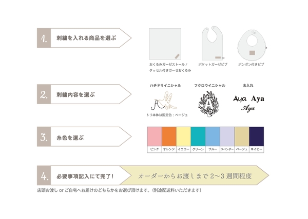 刺繍のオーダーは店頭の専用フォームをご用意しています。8つの商品タイプからお好みのアイテム、刺繍内容、糸色をお選びいただきます。店頭お渡しのほか、ご自宅へのお届けも可能で、お渡しまでは2~3週間です。