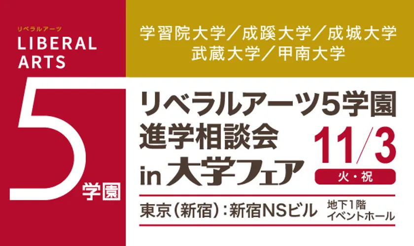 学習院大学・成蹊大学・成城大学・武蔵大学・甲南大学の5大学で構成される「リベラルアーツ5学園」は、旧制高等学校をルーツに持ち、現在も総合的な人間力を養うリベラルアーツを実践しているのが特長です。この5学園が、今年で33年目を迎える大学進学相談会「大学フェア」にて、「リベラルアーツ5学園 進学相談会 in 大学フェア2020」を開催します。