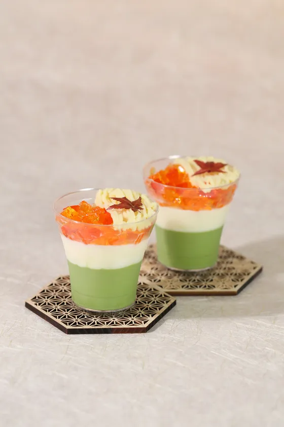 また、宇治本店お土産コーナーでは『もみじ抹茶パンナコッタ』を数量限定で販売いたします。抹茶とさつまいも、2層のパンナコッタ上には、レモン味でさっぱりとした3色の紅葉ゼリー、さつまいもペースト、紅葉をあしらいました。錦の秋を迎える宇治・祇園にて、みなさまのお越しをお待ちしております。