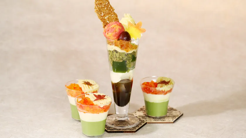 “京都の四季を大切にする”をコンセプトに誕生した新作メニュー『もみじ抹茶パフェ』は、抹茶餡の紅葉きんとん、紅葉ゼリー、栗の渋皮煮、さつまいもクリーム、チュイールアーモンドクッキーをあしらい、グラス上に実りの秋を表現。グラスの中には、抹茶ゼリーやほうじ茶蜜など、お茶屋ならではの具材で宇治茶の魅力を詰め込みました。美しい日本の秋を、目で、舌で、味わう季節限定パフェです。