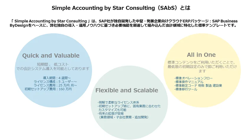 SAbSは「Simple Accounting by Star Consulting」の略称で、中堅・発展企業向けクラウドERPソリューションであるSAP(R) Business ByDesignをベースに、当社の導入・運用ノウハウに基づき必要機能を厳選して組み込んだクラウド会計パッケージです。( https://www.starconsulting.co.jp/sabs )