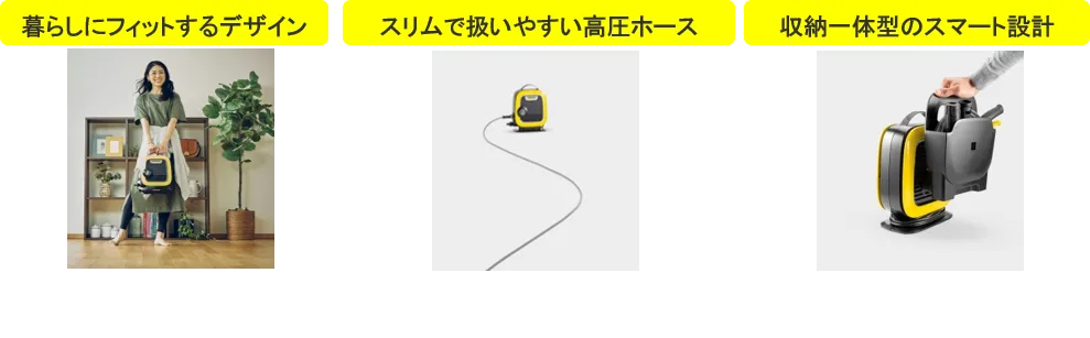 歳月を経て日本のお客様に最適な高圧洗浄機が誕生しました。日本の住環境やライフスタイルに合うデザイン性、スリムで扱いやすく丈夫な高圧ホース、そして本体と付属品がコンパクトに収納できるスマート設計が「K MINI」の特徴です。