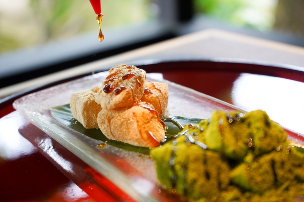 見た目にも涼やかで、口当たりのよい弾力が特徴のわらび餅は、黄金に輝く黒蜜をかけてお召し上がりいただくことで風流をお楽しみいただける、王道を極めた一皿です。