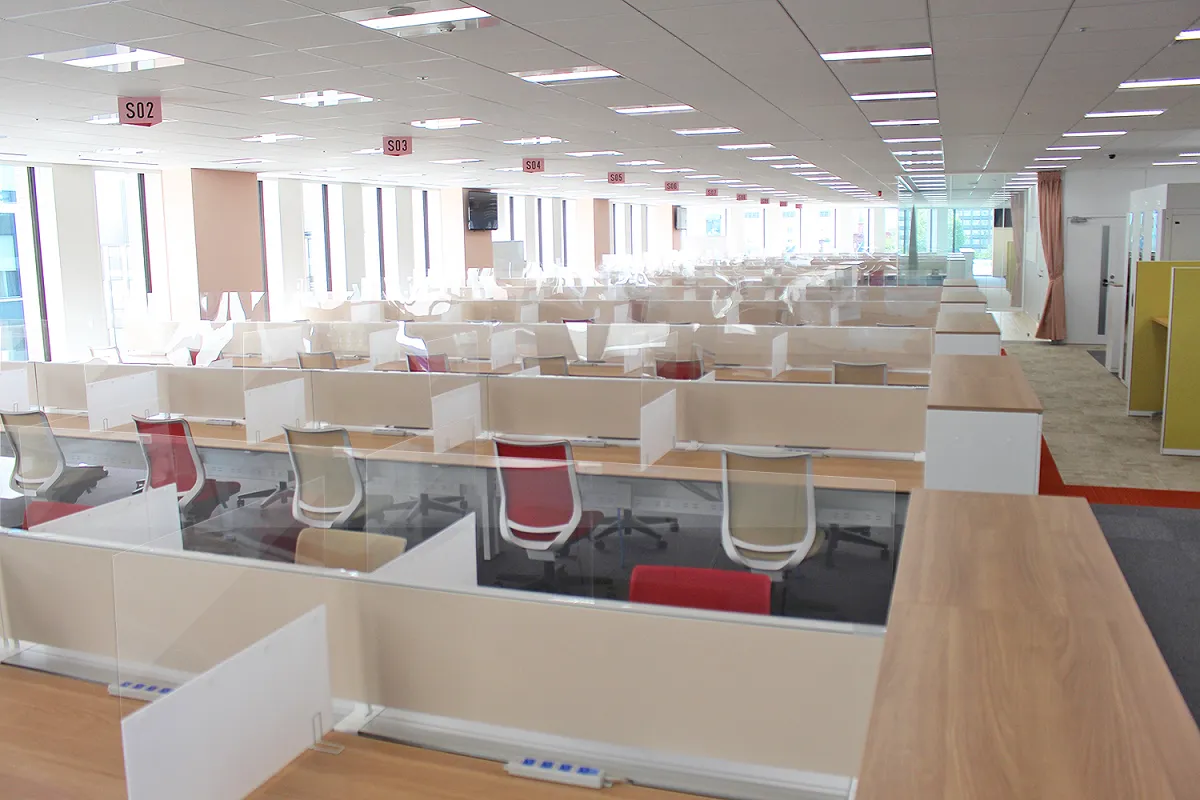 施設内には、クライアント企業様やその他の取引企業様向けに、オペレーションブースを見学できるショールームを設置するほか、新型コロナウイルス感染症対策として、体温を自動測定できるサーマルカメラをはじめ、ソーシャルディスタンスおよび非接触を考慮し、全席への飛沫防止パーテーションや、消毒液スタンド・ドアノブのレバーアタッチメントなどの設置を行います。