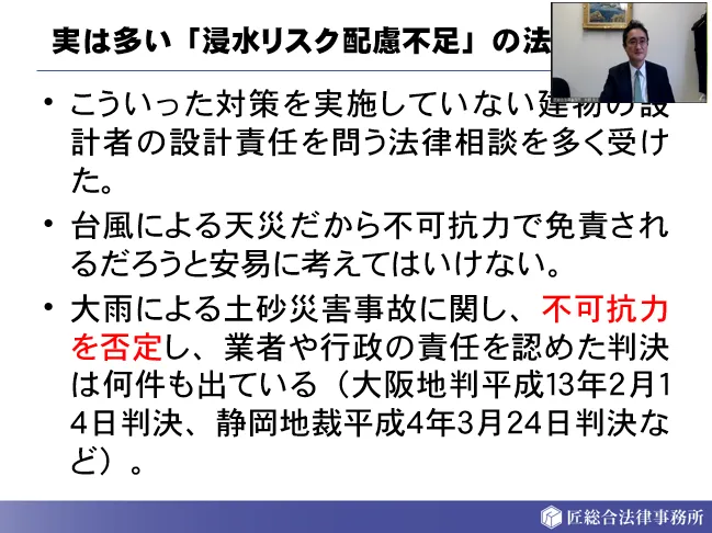 匠総合法律事務所の秋野弁護士には自然災害事故における工務店が注意すべきポイントについて解説頂きました。土砂災害では様々な判例から不可抗力で起きた事故といえるか否かが法的に重大であるとし、今後は「未曾有の豪雨」が起きる毎にその水準は上がるので更なる対策が求められると警鐘を鳴らしました。