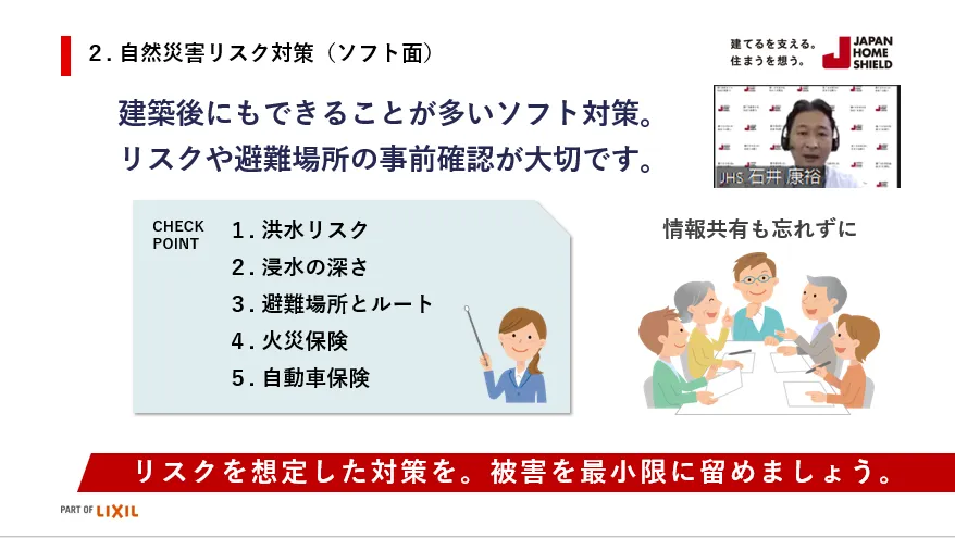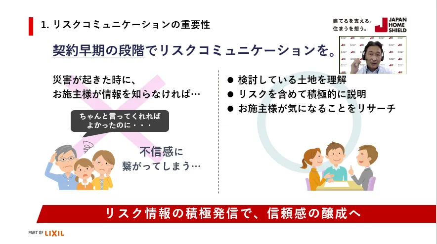 JHS東日本営業部長の石井からはお施主様とリスクコミュニケーションを取る際のポイントを解説しました。