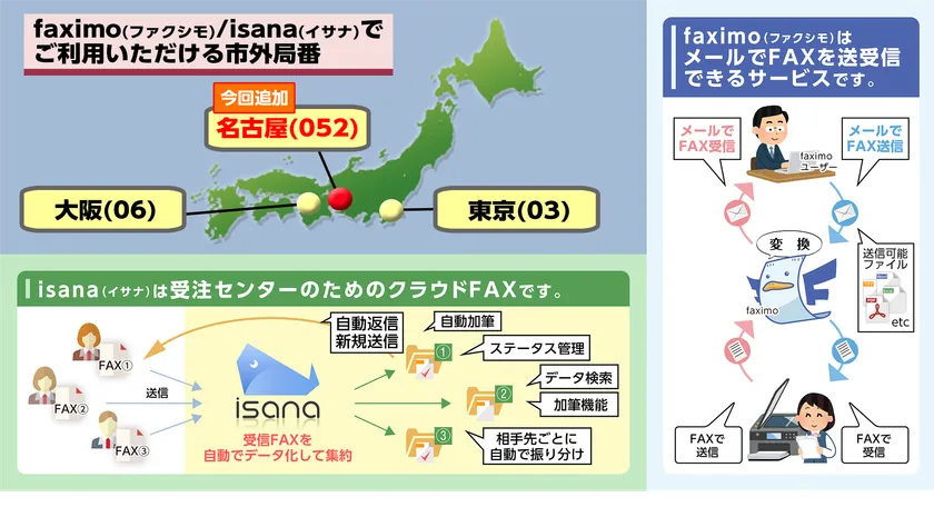 インターネットFAXサービス『faximo』、 クラウドFAX『isana』で名古屋(052)の市外局番がご利用可能に