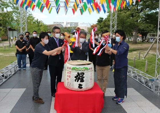 本日、「てんしば5周年記念セレモニー」として主催者やテナント代表者による酒樽の鏡開きを実施しました。また、セレモニーを見守った先着30名の入園者様に、秋の花とウッドチップで彩られた花小路にて、周年のロゴをあしらった日本酒の小瓶や、お子さまへのステッカーのプレゼントを行いました。