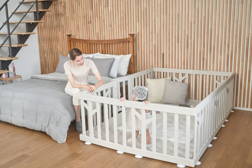 プラスティック製ベビーサークルの機能性と木製のデザインが両方叶う!
