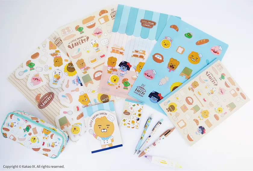 いちごに囲まれたキュートな“いちご柄”、キャラクター達がパン屋になった可愛らしい“ベーカリー柄”のステーショナリーシリーズ。120円~1,600円(税抜)