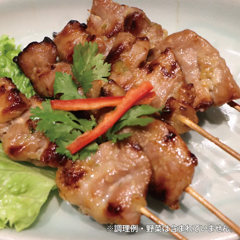 「ムーピン」とは、タイでは屋台でよく売られている豚肉の串焼き。タイの大衆料理のひとつで、日本人にも食べやすい味付けです。そのままかぶりつくのも良いですが、タイではもち米と一緒に食べるのが一般的。辛さはありませんので、お子様でもお召し上がりいただけます。