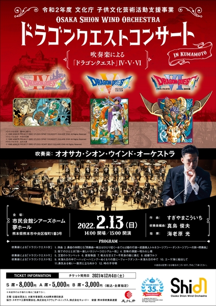 日本で最も長い歴史と伝統を誇る交響吹奏楽団の Osaka Shion Wind Orchestra を有する公益社団法人大阪市音楽団(本社:大阪市住之江区/理事長:石井徹哉)は、文化庁子供文化芸術活動支援事業(劇場・音楽堂等の子供鑑賞体験支援事業)の取り組みとして、2022年2月13日(日)に、市民会館シアーズホーム夢ホールにて開催いたします「ドラゴンクエストコンサート in 熊本」に、抽選で18歳以下の方160名様を無料でご招待します。