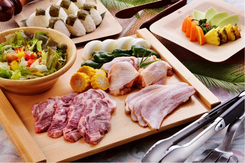 <ブラックアンガス牛リブアイ100g、奥丹波鶏モモ肉150g、ヤマトポークソーセージ90g、シーフード(大海老・帆立・イカ)、季節の焼野菜、おにぎり、サラダ、フルーツ>