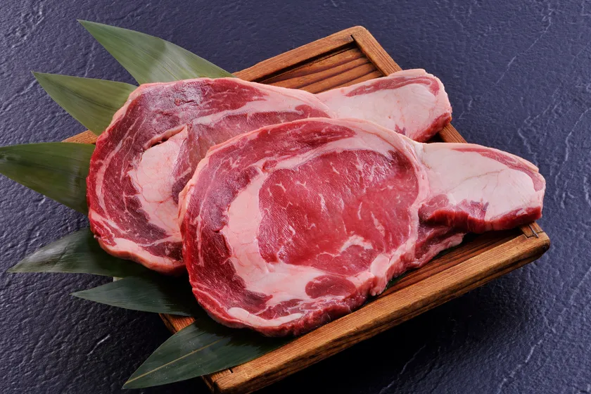 <ブラックアンガス牛リブアイ100g、奥丹波鶏モモ肉150g、ヤマトポークソーセージ90g、季節の焼野菜、おにぎり、サラダ、フルーツ>