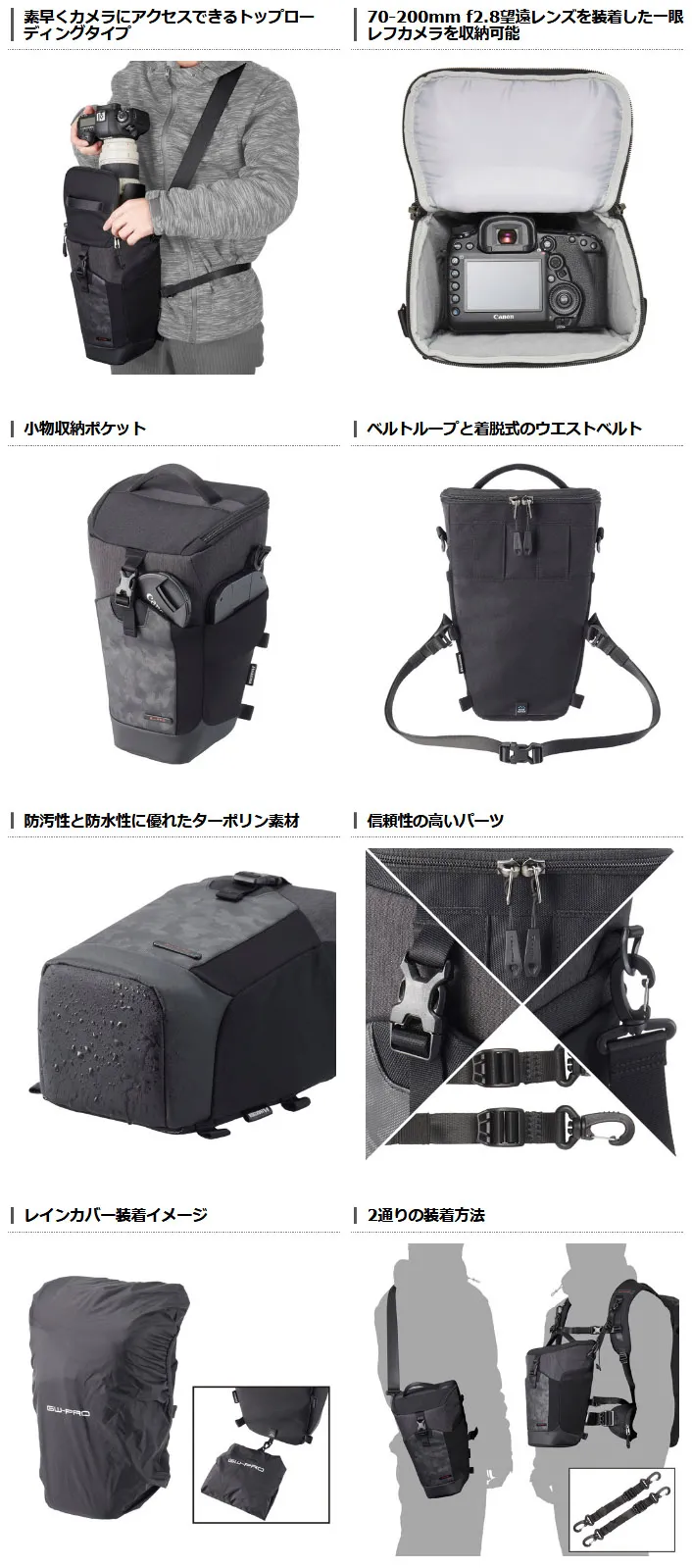 「GW-PRO RED」シリーズは、被写体を求めて海外を飛び回る、スタジオ撮影に向けて大量の機材を運ぶ、日常の中から一枚を切りとる、といったフォトグラファーのニーズに合わせた目的設計を徹底。重量のかさむカメラ機材の負担を軽減し、より多くの場面で利用しやすくなったハイエンドカメラバッグシリーズです。